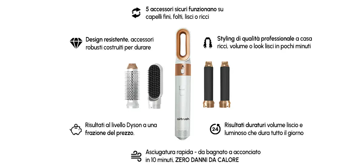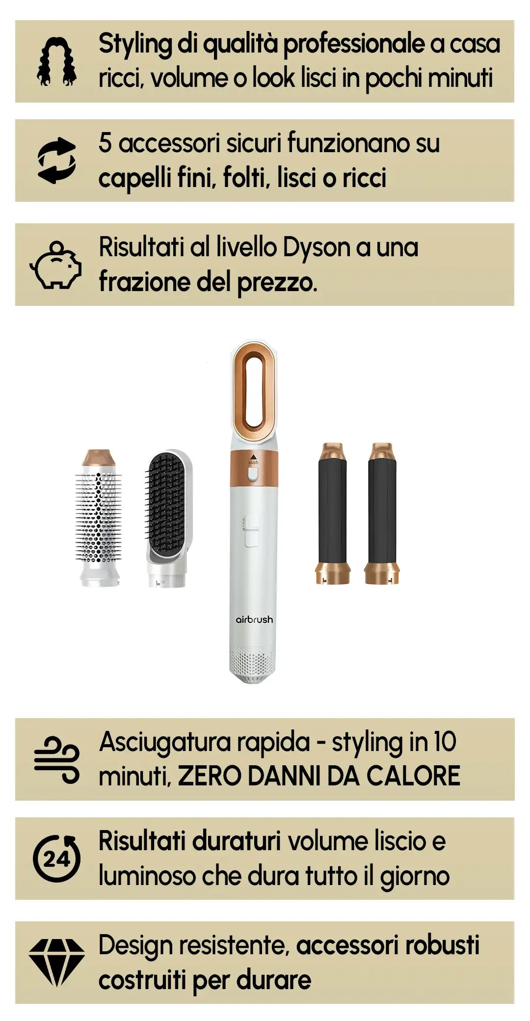 Il Multi Styler 5 in 1 include diversi accessori intercambiabili: ferro arricciacapelli, spazzola lisciante, pettine riscaldato, ecc.